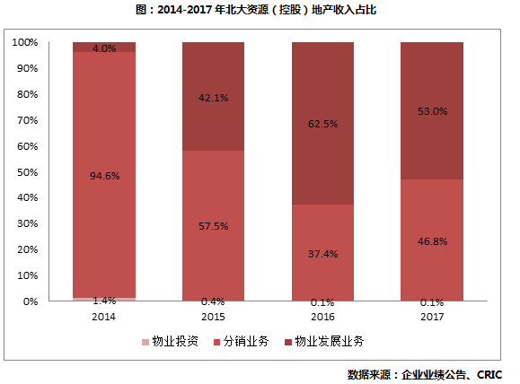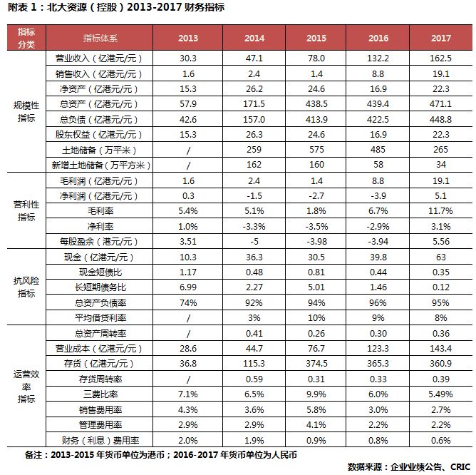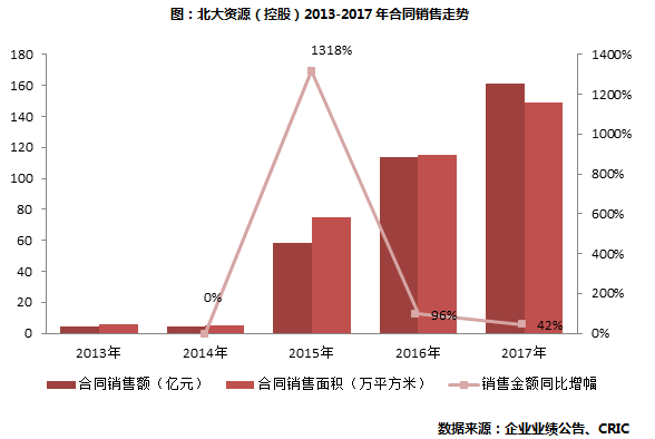 北大资源(控股)自13年进行资产重组,收购控股股东旗下地产项目之后,才开始将业务拓展到房地产领域。并在14年完成最大的一次资产注入,即收购控股股东位于重庆、长沙、佛山、成都、贵阳、青岛及武汉合共12个地产项目,从而快速提升销售额,并在16年突破百亿。17年实现合约销售金额161.3亿元,同比增长约42%,与百强房企的平均增速水平相当。