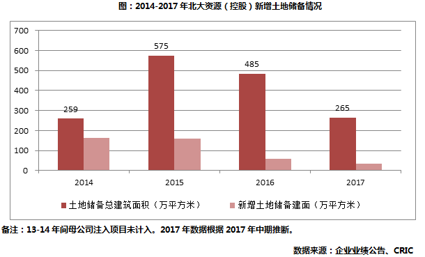 根据2017年中期数据推断,截至2017年底,北大资源土地储备面积约为265万平方米。从北大资源(控股)的拿地方式来看,除了在13-14年间通过资产重组的方式,获取母公司的地产项目之外,主要还是以招拍挂获取项目。由于目前公开土地市场面临很大的竞争压力,根据CRIC监测,17年北大资源(控股)新增土地有限,截止目前的预估的总土储相对于目前的销售节奏来看,仅可维持2年左右的开发。如果上市平台北大资源(控股)要实现业绩的快速增长,在未来势必要借助于集团的进一步资产注入。