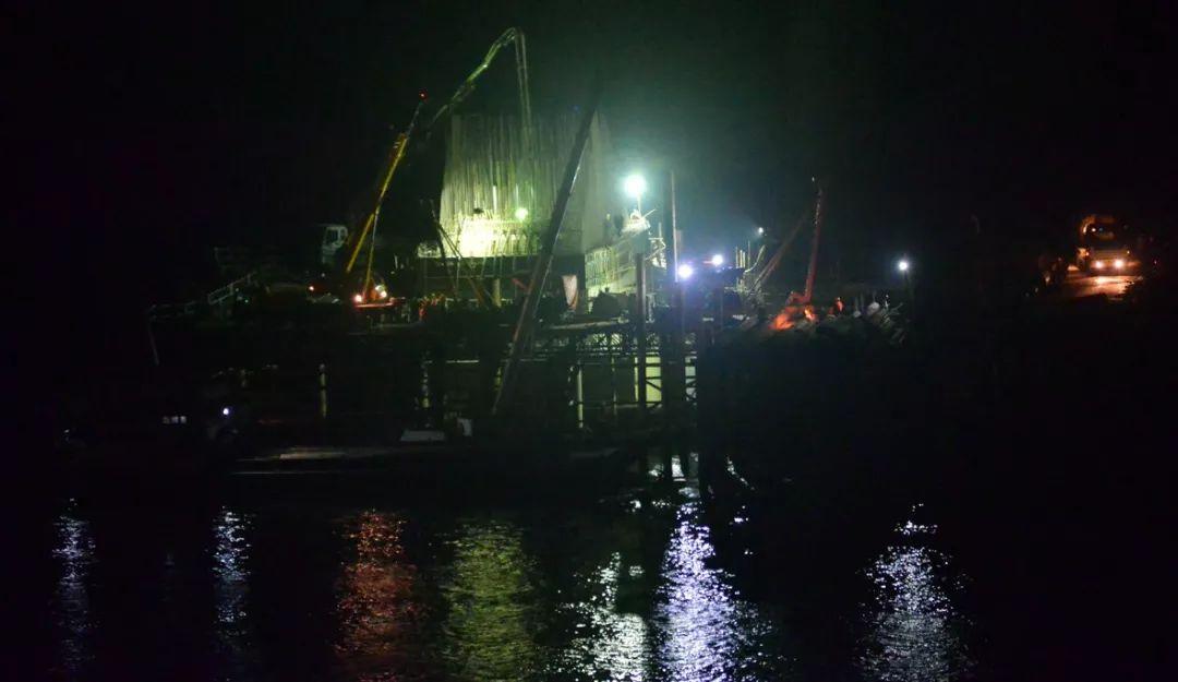 近日,西江四桥12号墩挑灯夜战,连续浇筑混凝土。