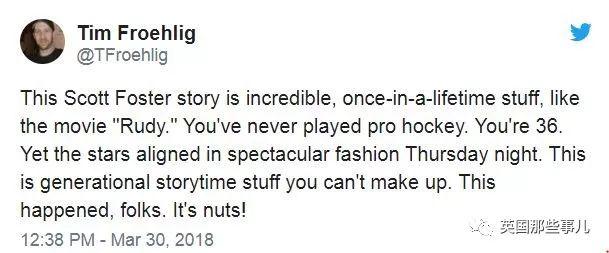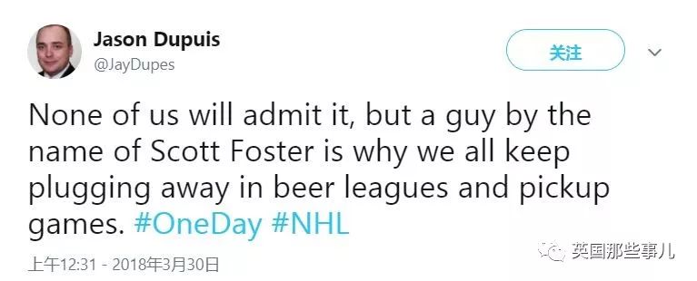 “Scott Foster就是我们为什么要在啤酒联盟(成人娱乐性质的冰球联赛)坚持这么久,为什么要不断进行比赛的原因!”