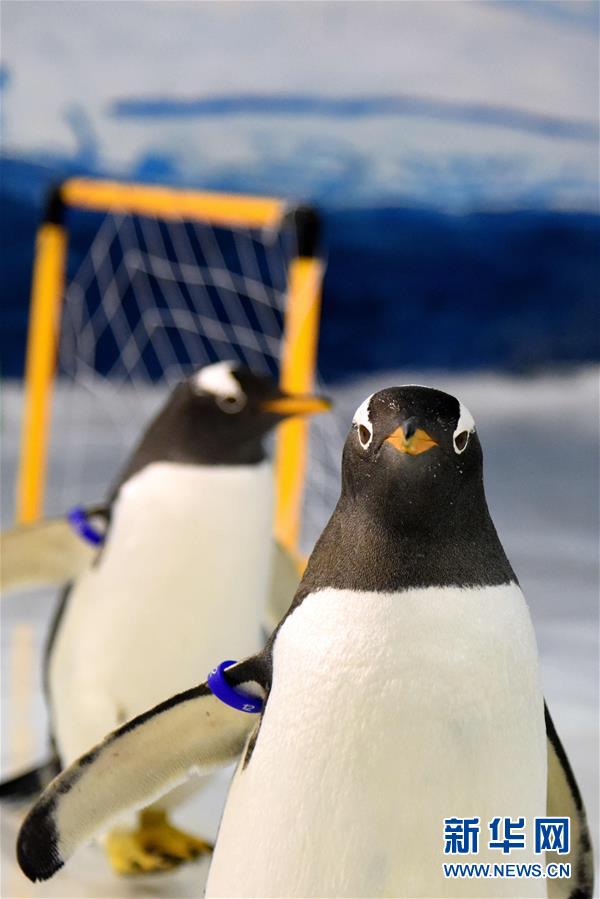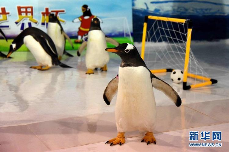 6月14日,在中国的黑龙江哈尔滨极地馆,6只极地企鹅分成两队,上演了一场萌味十足的“世界杯”比赛。