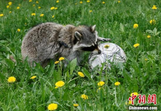 小浣熊在花海里“带球前进”。