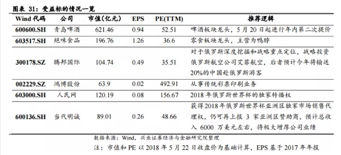 联讯证券表示,世界杯概念中,“啤酒、版权、彩票一个也不能少”。啤酒行业中,销售旺季叠加重大赛事拉动啤酒产销两旺;版权行业中,“直播版权合作+援助商代理权分销”成为本届杯赛全新商业模式;体育彩票行业,在网售禁令下,电视售彩有望直接受益;境外旅游则看好俄罗斯及东欧线路。