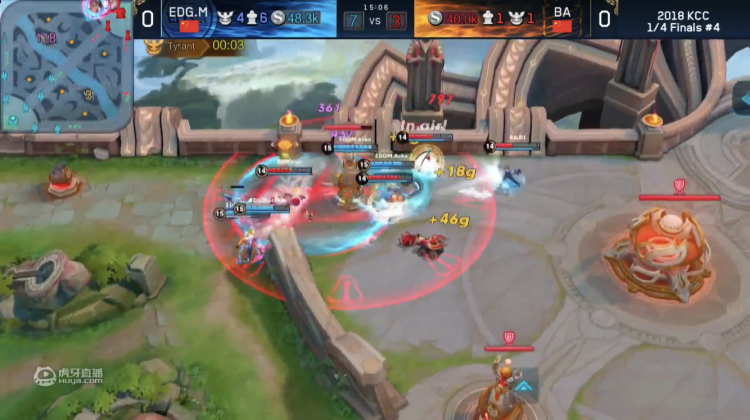 之后几波来回,EDG.M一直压制BA的活动区域,中间又杀了一次项羽,但是始终没有入侵到野区或者破掉外塔。为了挽回对线的劣势,BA选择换线。一经过换线,BA开始借助野辅转移的时间差,在EDG.M野辅在中路压百里守约中塔的时候,一边利用花木兰的清线速度优势,一边利用项羽的坦度,开始反压EDG.M的双边。在项羽被四人集火的时候,BA利用大乔的机动性,成功拔掉EDG.M的。而项羽因为坦度的加持,在倒下之前清掉了上路的兵线,保住了自己家的外塔(至少拖到李元芳留在上路等了一段时间之后才拔掉一座外塔,且没有对二塔导致任何威胁)。而且BA卡住了第二条暴君的时间,在压掉塔后趁着EDG.M回退的时间拿下暴君。
