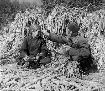 两幅作品的其中一幅摄于1986年,画面上一位农民挽起裤腿扎着弓步,用力扯着前面的两头耕牛,这幅作品名为《征服》。另外一幅叫《朴实的爱》,两位头发花白的老人蹲坐在麦地里,戴着瓜皮帽的老汉一手托着烟袋锅,一手探出去给妻子擦汗。他的大多数早期作品都是黑白的,“耐看”。