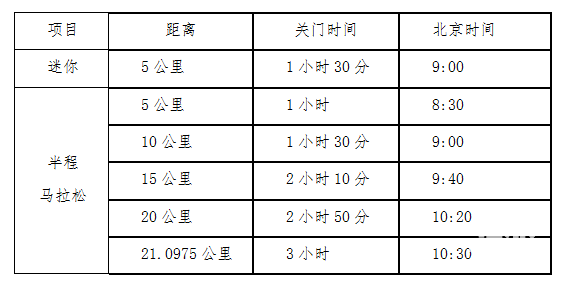 关门时间以发令枪声时间计时,具体见下表:(关门时间3小时)