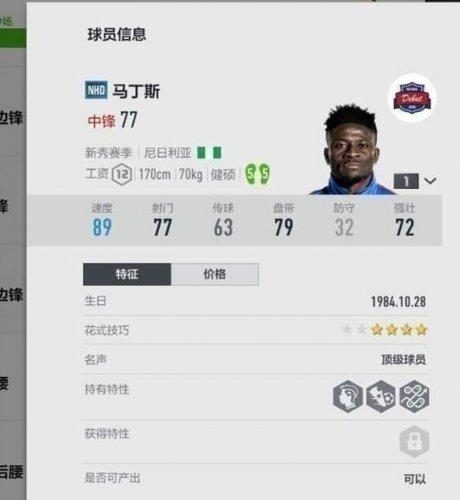 NHD 马丁斯:小钢炮类型的球员,身高虽然很矮球场内模型看着很宽所以看着很大,防反类型的前场单箭头球员,速度和灵活度非常不错临门一脚略差,往前控球时按住护球键往前控球,侧位能够很*力暴**的挤开防守球员,170 的德罗巴,双五脚射门很好很强大,因为模型身高矮,基本无头球,加 5 应该能起飞。单卡 5W 左右。