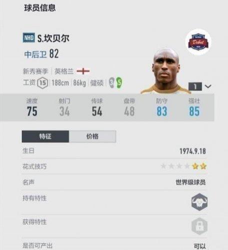 NHD 坎贝尔:这张卡价格不低需要 26W 左右,但是绝对能让你的防守档次上升到一个档次,除非你把压迫调到很高,让别人钻你后门。这张卡的优势在于模型其大是堵墙,但是速度绝对不算慢,UL 大罗进攻一个卡位或者伸脚直接挤开,简单而*力暴**的防守美学。别人在禁区内遛狗,只需要按住 A 键跟随因为模型大总能破坏他的传球或者射门,非常实用的球员。在发角球时他的头球也是非常强劲总能卡住对面动作,要怎么说模型就加了 5 点的能力值。