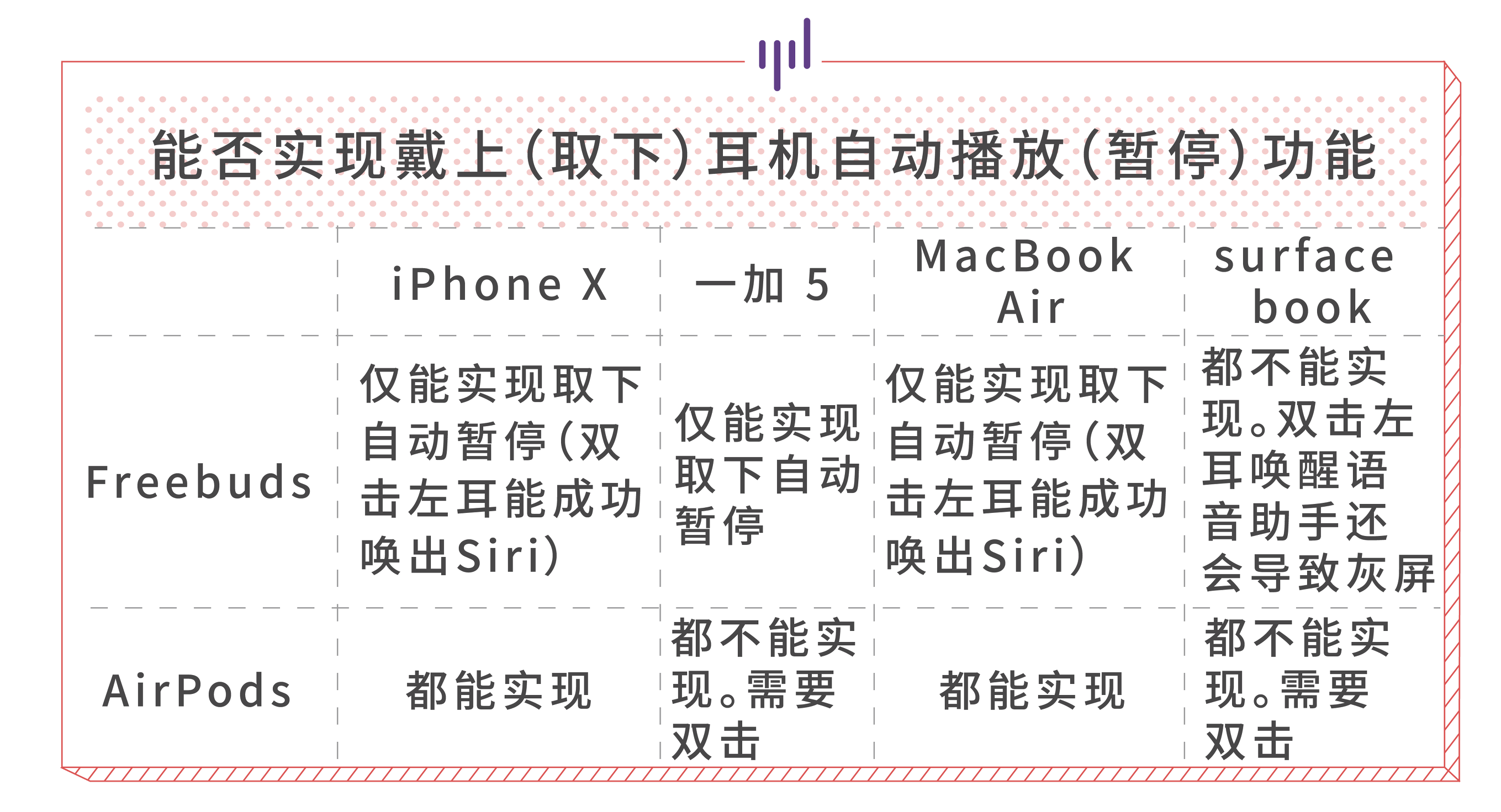 而 AirPods 这一行业标杆性的功能,在华为 Freebuds 身上也有一模一样的表现。而且不管是苹果的 AirPods 还是华为的 Freebuds,在测试的四台设备上这一功能都表现得非常好。