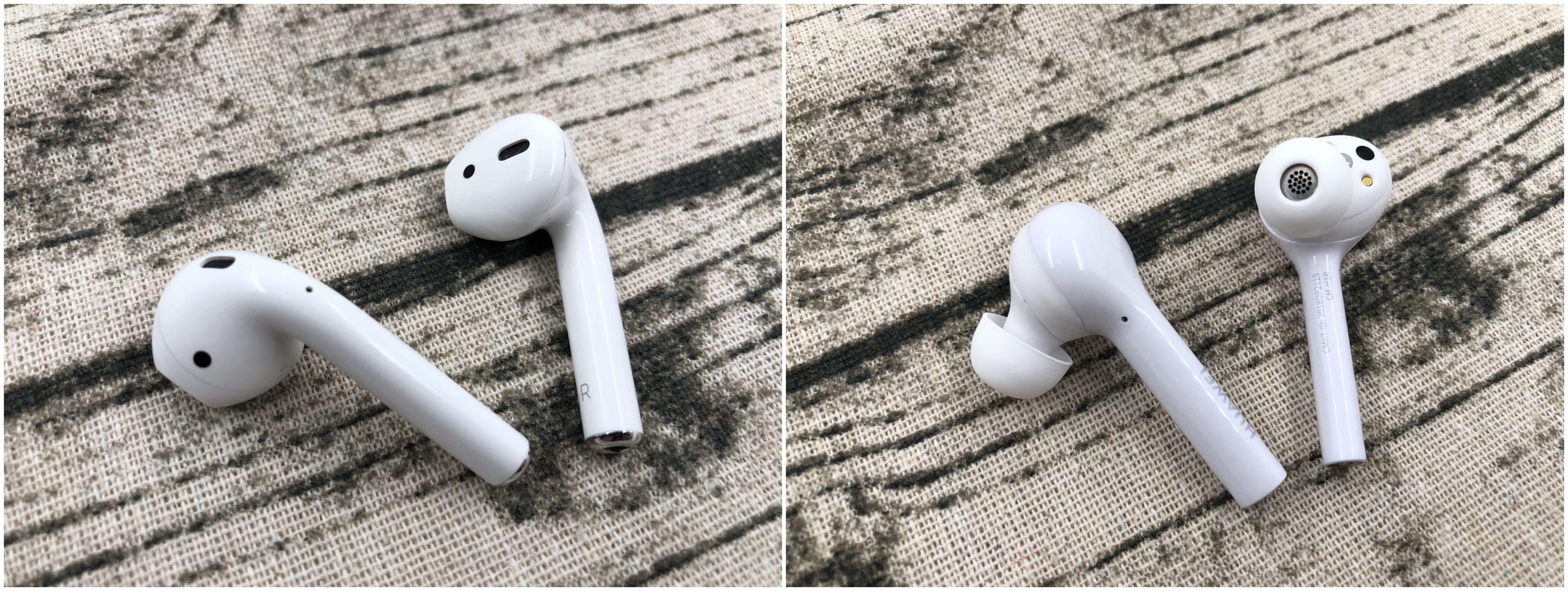 左为 AirPods 耳机 ,右为 Freebuds 耳机