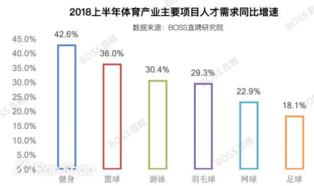 大众健身领域的人才需求增长势头最为强劲,2018 年上半年人才需求同比增速达到 42.6%,篮球、潜水项目分列二三位;