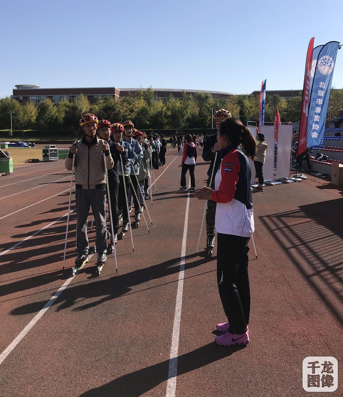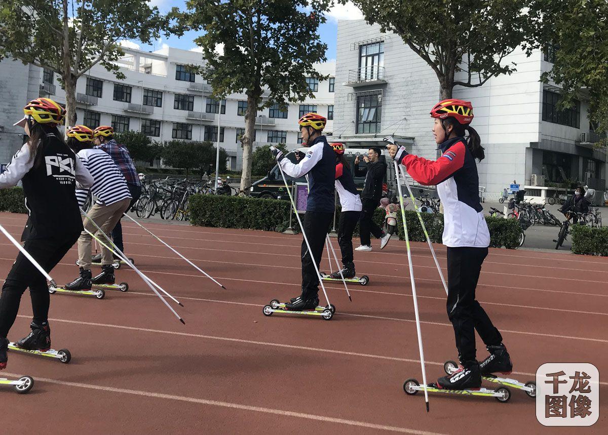 10月9日,由北京市滑雪协会承办的“一校一故事、越野越精彩”全国高校滑轮推广系列活动在北京清华大学拉开帷幕。图为学员们在教练的带领下学习越野滑雪。千龙网发 曾静摄