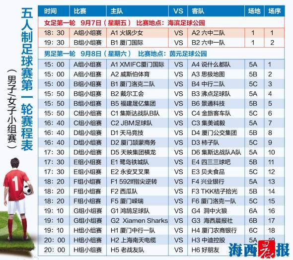 海西晨报讯(记者 赵钧天)2018年厦门市全民健身运动会足球项目今起正式开战!本次足球项目以五人制足球的形式进行。今晚,女足首轮比赛将于18时30分在海滨足球公园率先打响。
