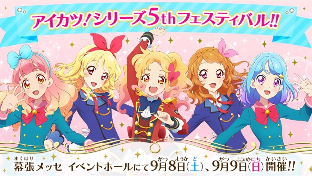- 主题:アイカツ!シリーズ 5thフェスティバル!!DAY1 地点:千葉/幕張メッセ イベントホール 出演:諸星すみれ、下地紫野、富田美憂、松永あかね、木戸衣吹、田所あずさ、大橋彩香、沼倉愛美、和久井優、石川由依、齋藤綾、山口愛、村上奈津実、宮本侑芽、美山加恋、二ノ宮ゆい、保村真、日笠陽子、江口菜子(ひななた)、藤原夏海、前田佳織里、豊永利行、八代拓、上村祐翔、堀江瞬、ランズベリー・アーサー、平川大輔、霧島若歌、遠藤瑠香、藤城リエ、天音みほ、松岡ななせ、高田憂希、陶山恵実里、桑原由気