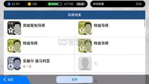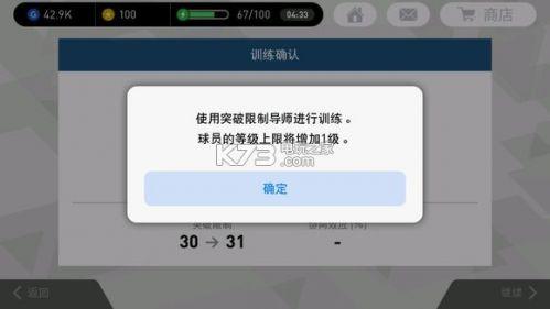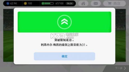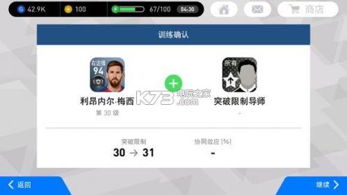 突破限制:提高球员的最高等级,但不能超过最大等级上限。突破限制的方式有两种。第一种方式是通过突破限制导师(打活动可获得,黑色的),一个突破限制导师只能提高任意一个球员最大等级1级,比如你的某个球员最大等级是30级,使用3个突破限制导师后最大等级变成33级。第二种方式是用相同球员进行突破,比如你有2个梅西,把一个转导师,训练另一个,被训练的球员最高等级+5。