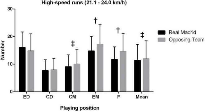 皇家马德里队与对方球队之间的高速跑(21.1-24.0公里/小时)次数的差异取决于球员的位置