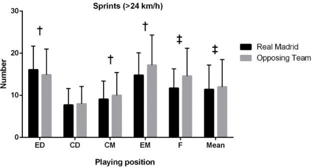 对于不同强度(短距离急速跑(> 24.0km / h)和高速跑(21.1-24.0km / h)),短跑次数(21.1-24.0km / h)的距离进行重复测量方差分析(ANOVA)小时和> 24.0公里/小时),皇家马德里的球员在高速跑( )和短跑冲刺( )比对方球员的距离短(p 0.01)。