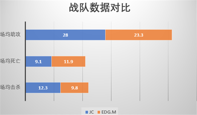 JC在场均击杀上是联盟的第一位,与EDG.M相比差距比较大。在场均死亡数上,EDG.M位于联盟第十二位,说明EDG.M在团战中经常发生团战损员或者说沟通不及时,不必要的伤亡的情况。在这一点上,EDG.M要加强队内的沟通,小心团战的站位,不要给敌方机会。JC在新赛季,打团的走位和细节都做的很好,团战基本上是以“能打赢的就打,打不赢就避战”的思路来进行的。