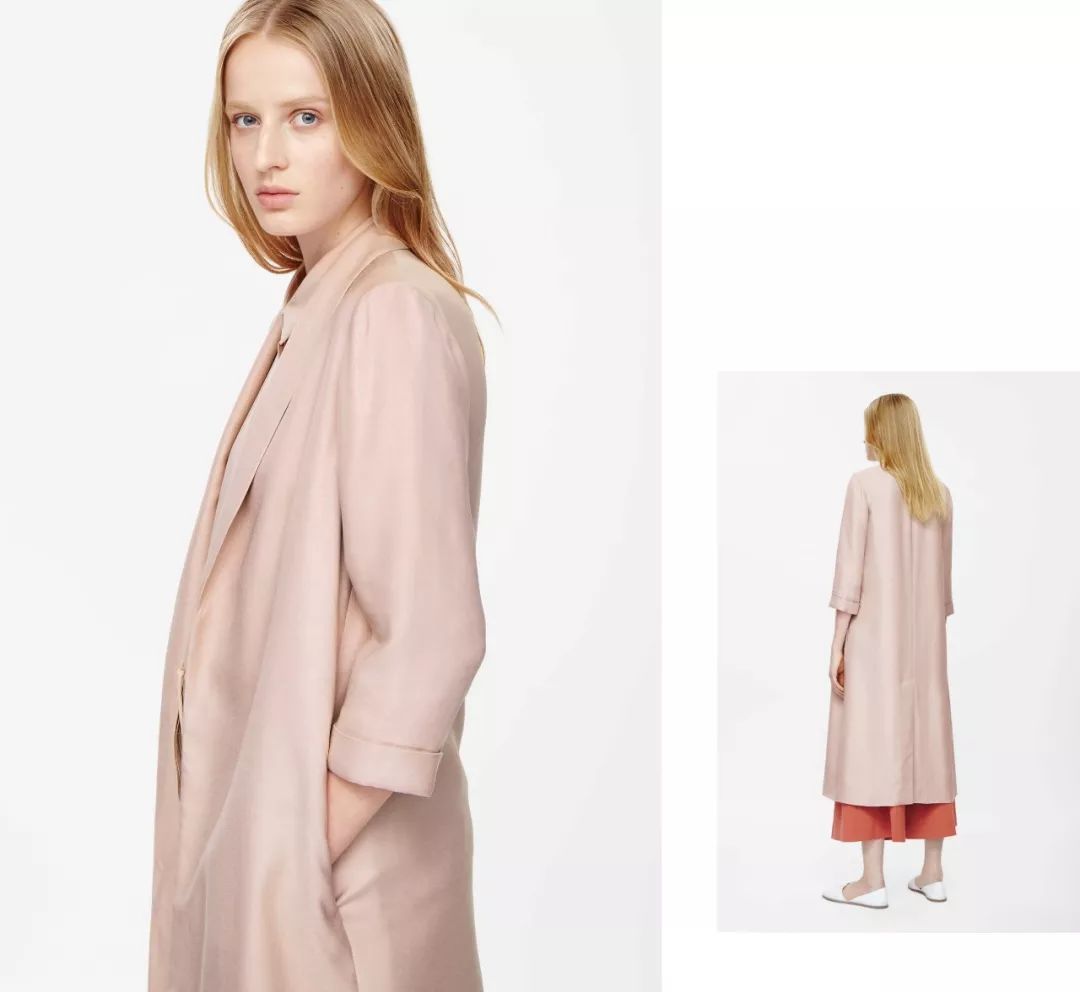 粉色也许不是最适合 Power Suit 的颜色,但饱和度较小的粉色有着黑灰白也不敌的冷淡感与高级感。Cos 的设计一向简约。偶尔披一件中性化粉色外套通勤,时髦之余也不会失了正装的严肃感哦。
