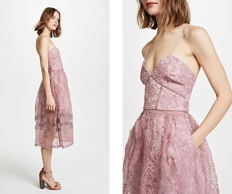 Self Portrait 向来就是假日衣橱必备品牌。蕾丝与粉色两个甜美的元素叠加却因轻盈的吊带与镂空设计而不显满,摇曳生姿,走路带风,非常适合度假心情。过膝的长度刚刚好带着一份小优雅。
