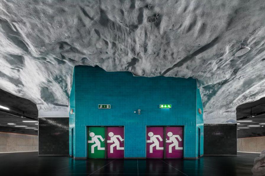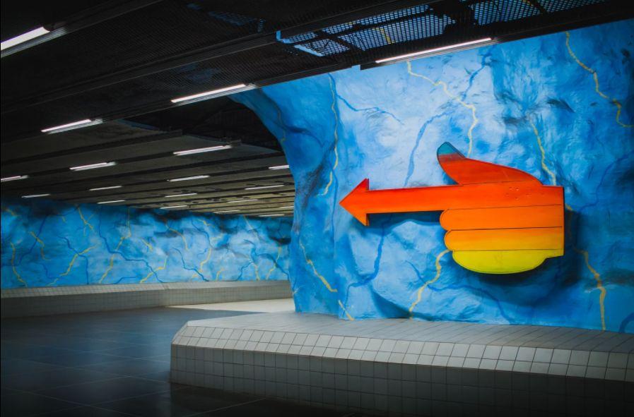 Stadion站,天蓝色的大理石岩壁,一道鲜艳的彩虹,再加上一些大型木雕,是艺术家为了纪念1912年在斯德哥尔摩举办的奥林匹克盛事而设计的。