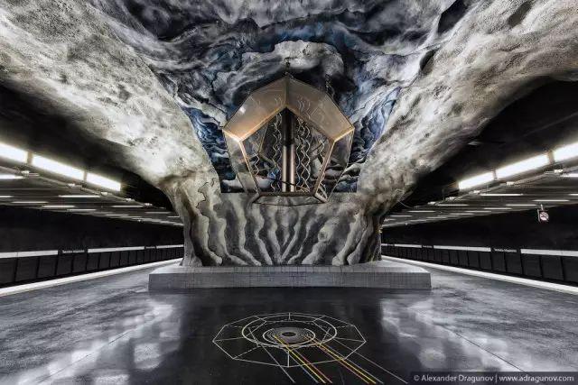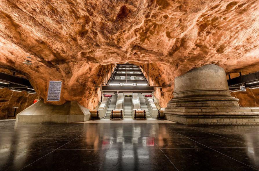 Rådhuset station(市政大厦站),1975年时,艺术家 Olsson 将这里打导致了一座棕色的地下溶洞,粗犷的天花板坑坑洼洼,透露出一丝原始的气息。