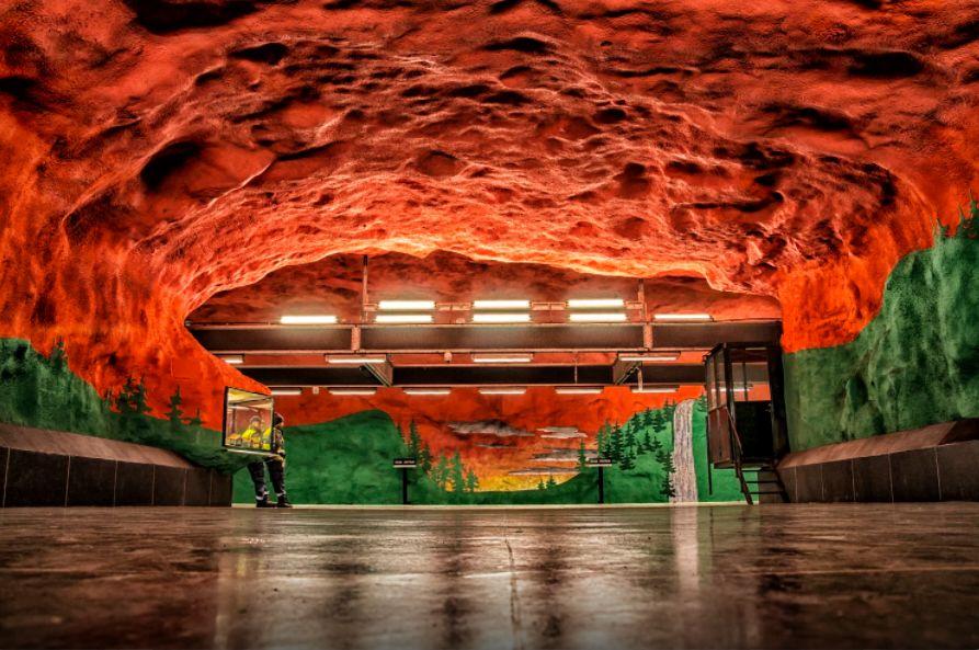 Solna centrum站,红天空配绿森林,给人强烈的视觉冲击。通过壁画和建筑模型,讲述了当时农村人口减少、森林和自然被破坏、以及环保运动的故事。