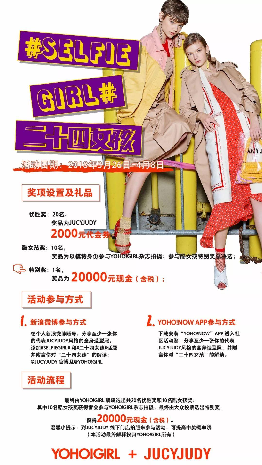 友情提醒大家:目前活动已进入倒计时阶段,身为酷女孩的你,又有什么理由缺席?欢迎爱时尚、懂搭配、又敢于SHOW出自我潮流主张的你,加入#SELFIEGIRL#二十四女孩行列!即刻分享自己最能代表JUCYJUDY风格的全身照参与活动吧~