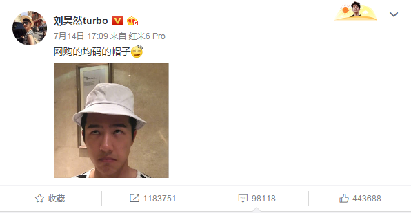 最近昊然弟弟在微博上更新了动态,发了一张自己头戴白色渔夫帽的自拍照,并配文到:“网购的均码的帽子”还附上了一个问号脸的费解表情。
