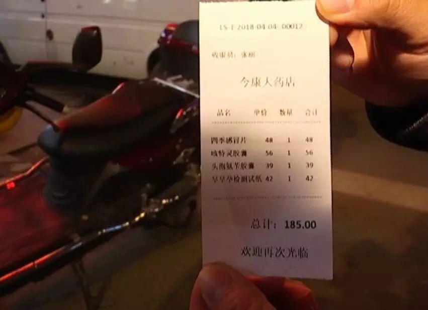 从跑腿小哥提供的买药单据上,可以看到,这四盒药是从一家名为今康大药店的药房购买的,总价格为185元。