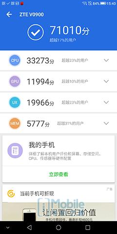 中兴V9采用一颗高通骁龙450八核心处理器,配合4GB RAM,日常APP切换、系统切换等操作还是很流畅的,虽然该机配置并非顶级,但也不免俗的进行Antutu跑分,最终7w+的得分也在意料之中,可以应对一些中小型的3D游戏。