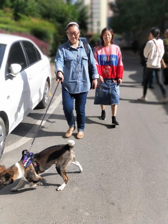 “‘五月’,好好走路,看到车。”“‘五月’,拉屎要在路边上。”昨日上午,在东三环附近的胜天人居门口,云姐牵着狗狗在小区门口四处转悠,看见“五月”拉屎了,她用纸捡起来丢进垃圾桶。“五月”的主人刘大姐是云姐3年前结识的朋友,由于太忙无暇遛狗,她便让云组从二环路东四段赶过来上门遛狗。
