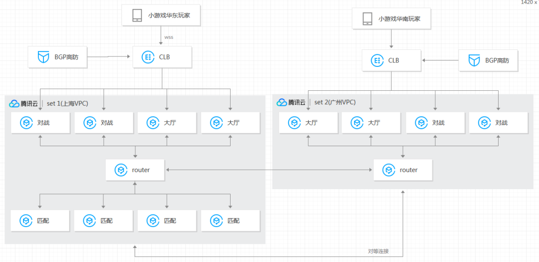 下图就是扩展星型结构在腾讯云上的一个实践,对于实时性要求高的游戏,比如坦克大战这样的游戏,可以多点部署,让玩家就近接入,华南的玩家接入到广州的 VPC,华东的玩家接入到上海的 VPC,两个 VPC内部分别部署了 set1和 set2,并且通过跨域对等连接打通,使得router1和 router2能够建立内网连接,实现全区全服。