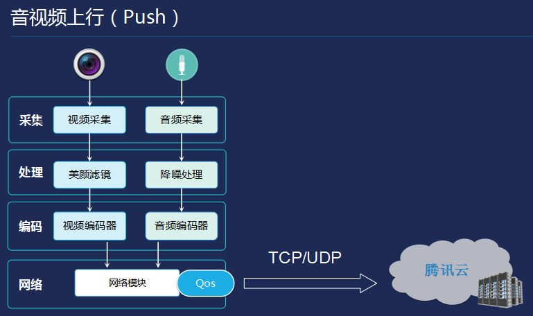 上行解决主要解决音视频的采集、处理、编码和网络几个问题,其实现过程为首先将本地的画面和声音经过采集然后进行预处理,如图片的美颜,音频的降噪等,然后进行编码,这部分主要试进行数据压缩,最后通过网络模块上传到云端。
