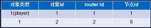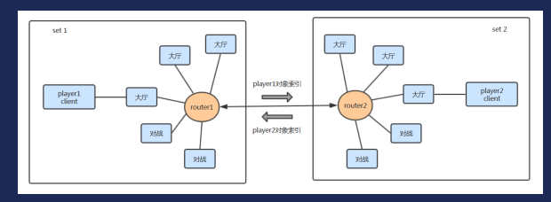 player1 在 set 1的节点 A上,player2 在 set 2的节点 B上,player 1向 player 2 发送组队邀请时,消息可以通过 router1 转发到 router2,最后到达 B节点,在 B节点中进行必要的判断处理,最后通知到 player2的客户端,这就要求 router保存所有对象的路由数据,类似下面这个表: