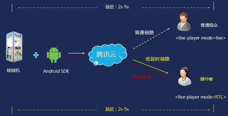 远程调控:以去年比较火热的在线抓娃娃机游戏为例,因为抓娃娃游戏对延迟要求非常苛刻,因此在解决方案上,需要构建和实现超低延时的实时音视频链路,这种链路能让操作者在很短的时间内看到远程设备的视频影像,保证娃娃机的可操控性。