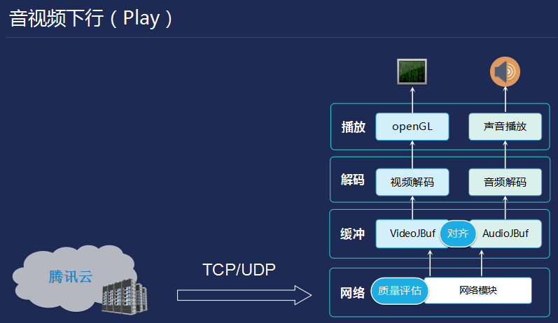 下行与上行对应,即将原来在云端的音视频数据通过网络传输、解码等操作进行*放播**,在音视频下行的过程中,视频或声音*放播**的速度直接取决于网络的时速,为了保证*放播**效果,需要在解码之前,对数据进行缓冲,这样,即使网络环境较差的情况下,也能在一定程度上保证*放播**顺畅。