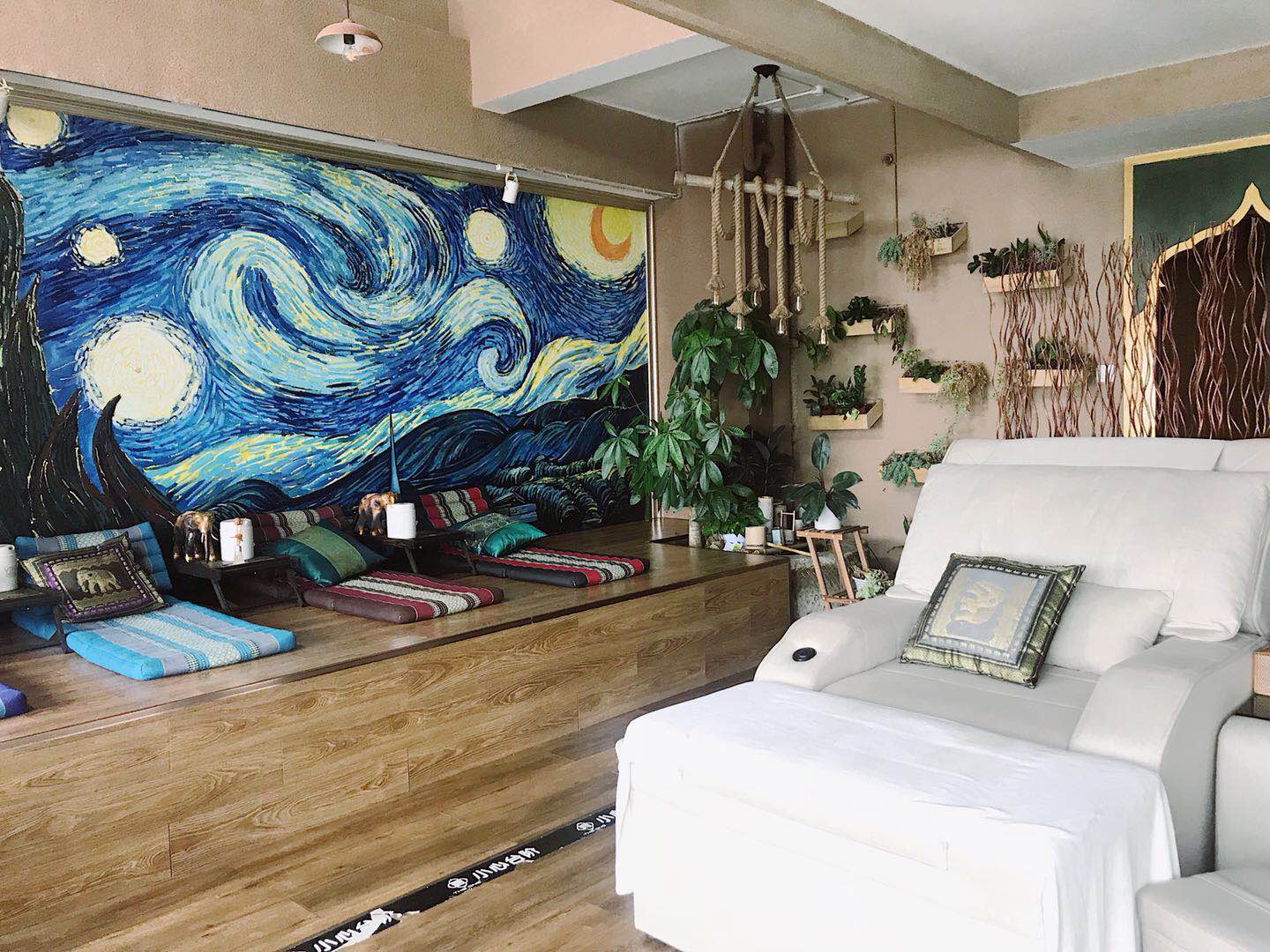 一进门,右手边是一副巨型梵高的《星空》,虽然不太明白这和泰式按摩馆有什么神秘的联系,但跟这些花花绿绿的萨瓦迪卡味儿并不违和。