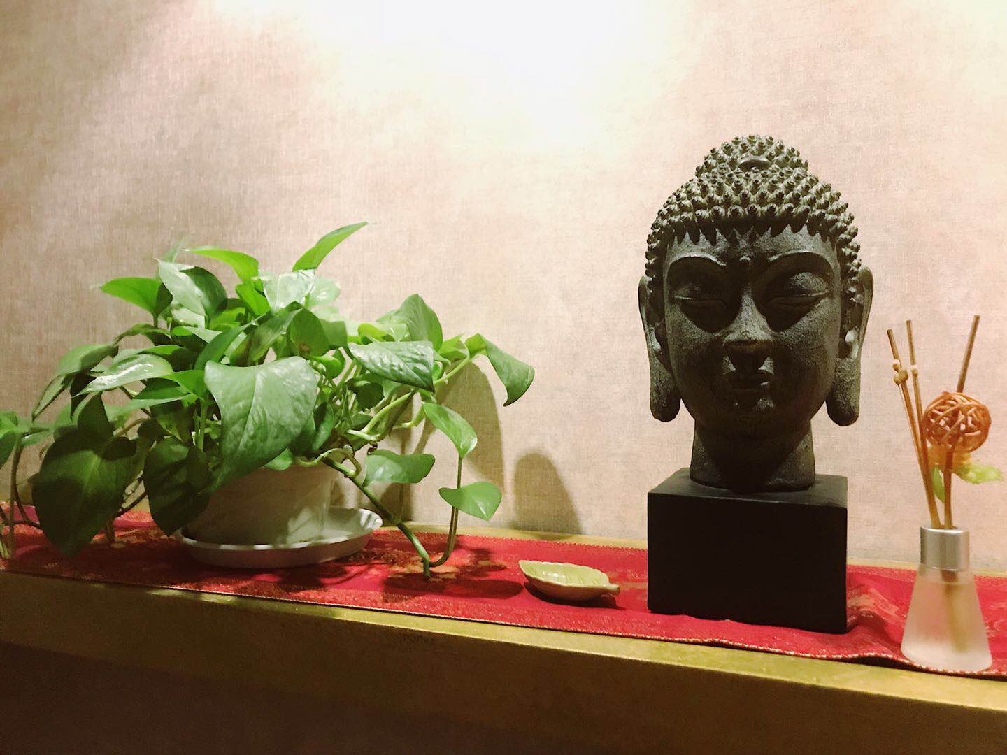 旁边小台上的佛祖一脸慈祥,嗯,本来激动等待按摩的心灵也慢慢平静下来。