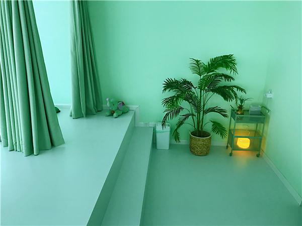 全身按摩的地方是在帘子背后,同样浅的绿色,白色百叶窗看起来也很新很干净整洁。角落里摆的几盆龟背竹之类的绿植也让人心情美好。
