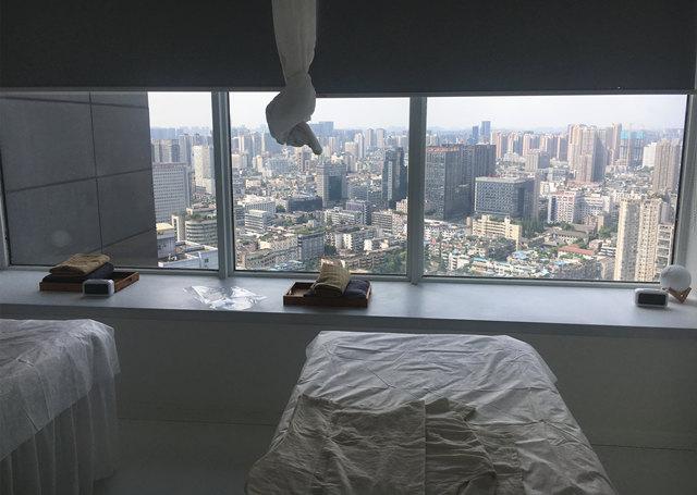 所有来这里按摩的人,都会径直走向这个三面环境的窗台,41楼的视角太值得拍照炫耀了,成都的一景一物就像是房间里自然的壁画一样。