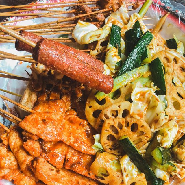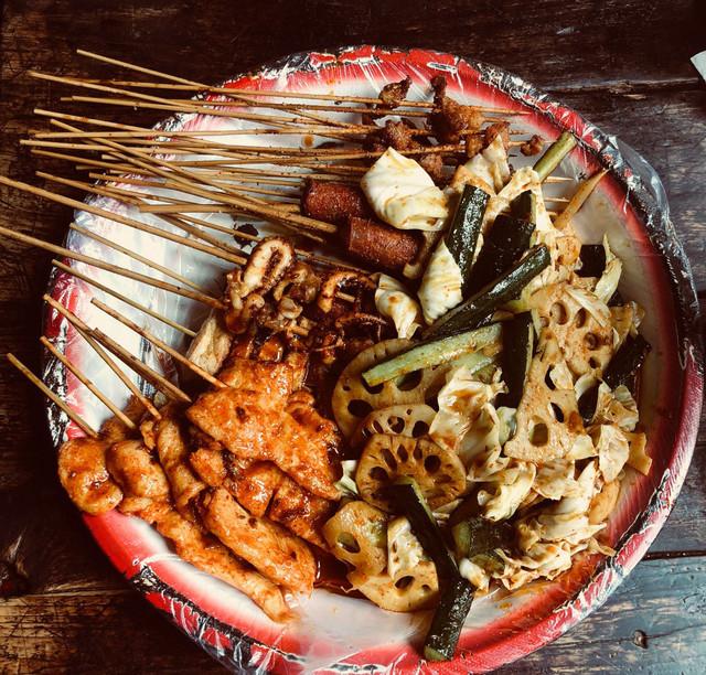 一个是老长沙油炸社,吃遍了成都的各种串串,还是第一次尝试这种炸串串,炸串串算是长沙的特点,就是把荤素的串串都往油锅里稍微炸一下,也不是炸的很狠的那种,然后裹上长沙式的辣椒面或酱,一大把堆在盘子里,看着就很有食欲。