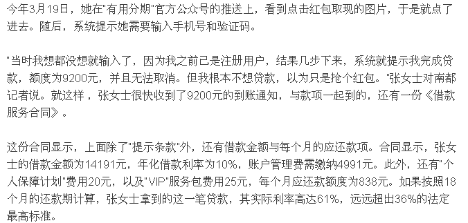 目前,市场上的“砍头息”可理解为合同约定本金与实际到账金额的差额统称,包括出借人收取的部分利息,居间人收取的服务费、管理费等。张女士只在“有用分期”借了9200元,合同却出现15000多元还款额,是典型的“砍头息”。