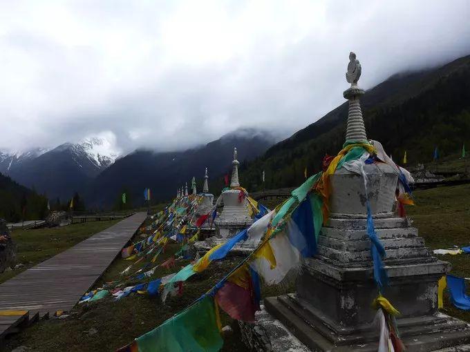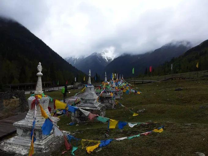 在牛棚子,傲立于草甸的白塔,映衬于雪山之下,神秘圣洁;五彩经幡随风飘动,送去藏民为众生的祝福,享用美景的同时,赞叹着藏民的善良与坚定。
