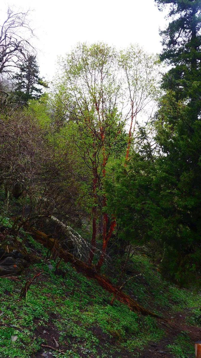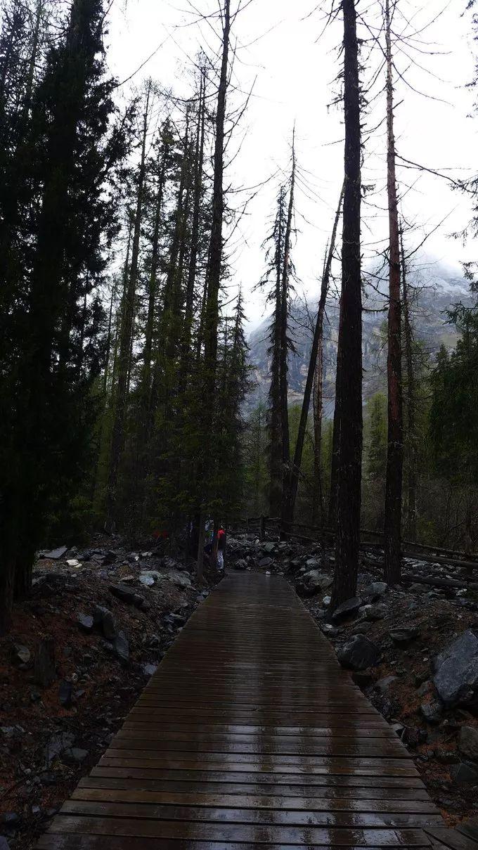 沟尾三面环山,尽管雨雾蒙蒙,仍能看到不远处的雪山,雪线以上的山峰是黑褐色的岩石,山巅覆盖着冰雪;雪线以下便是红杉林带来的生命色,其雄伟冷峻让人肃然。那隐匿在云雾背后的雪山又该是怎样景象?沿着栈道,在红杉林中环绕了一周,红杉树挺拔昂扬伸向天空,全不在意游人的打扰;这里海拔在3800m以上,置身山谷和高高的红杉树下,会深感人的渺小。