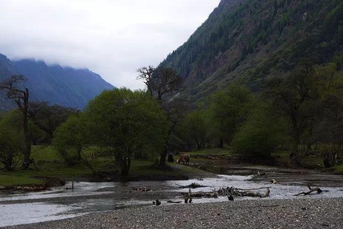 沿着人参果坪的小溪漫步,放眼坦荡妩媚的草地,这里山水相依、草木相间、云遮雾绕,透过沙棘树沿溪流回望,云雾笼罩的青山、沙棘树丛、潺潺溪水和牦牛构成了一幅和谐画卷。