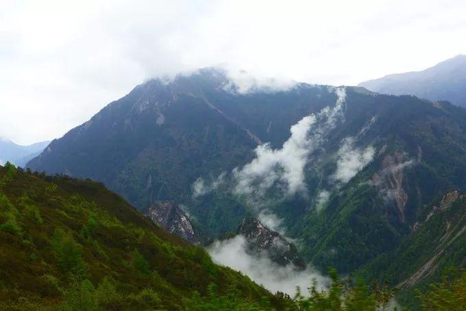 午餐后,我们出发翻越巴郎山。山由近及远呈现出绿色、褐色、黛色 ,车在雾中穿行,云在脚下流淌。我被美丽的景色吸引,不时探出窗外去拍照。