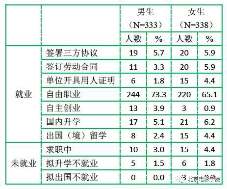 本校 2016 届毕业生总数为 671 人,在性别、生源地区和学历层次方面的分布如下表所示,男生 333 人,占 49.6%,女生 338 人,占 50.4%;北京生源 142 人,占 21.2%,京外生源 529人,占 78.8%;专科生 61 人,占 9.1%,本科生 447 人,占 66.6%,研究生 163 人,占 24.3%。