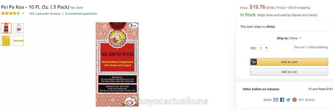 这是亚马逊购物网站的300毫升枇杷膏×3瓶的价格,为19.76美元。