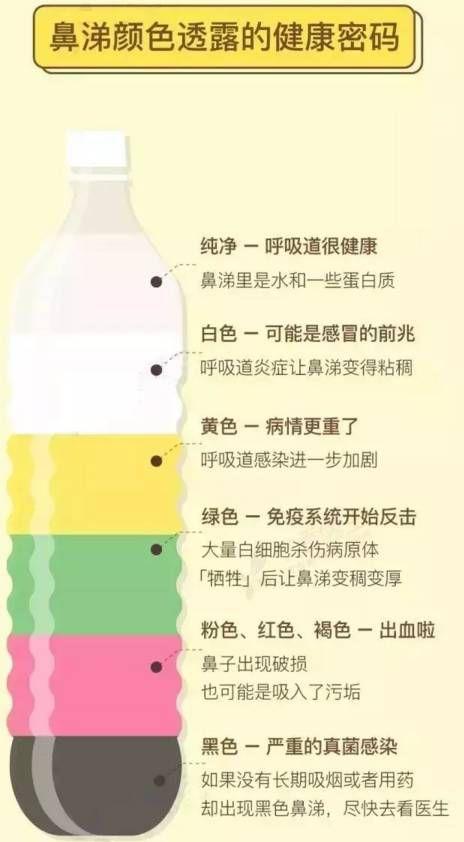 那么,重头戏来了,当鼻粘膜产生炎症、病变时,鼻涕也会发生变化,怎么能通过鼻涕辨别鼻炎呢?看了这个你就知道了: